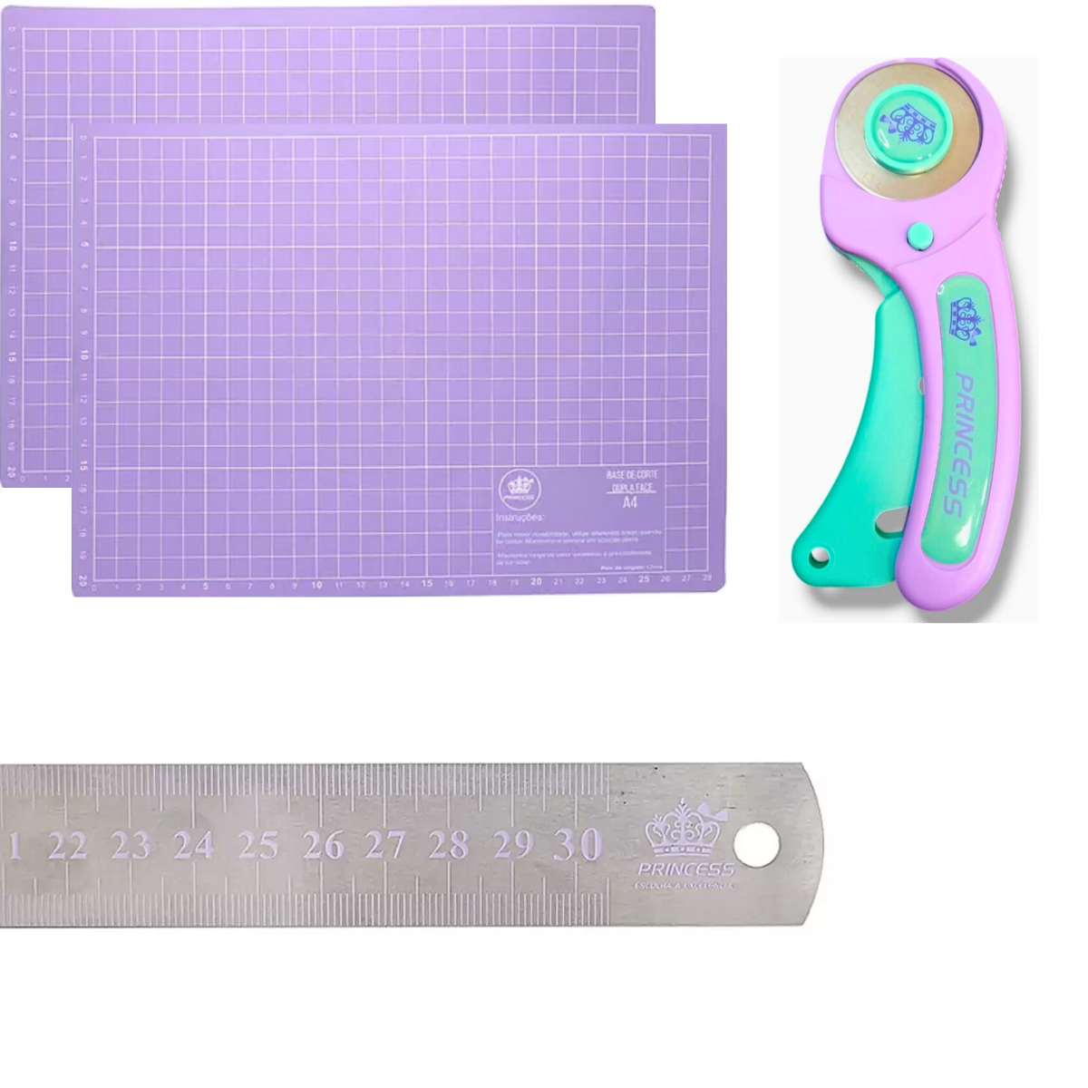 Composição: PVC (Base de Corte), Plástico e Inox (Cortador Circular e Régua de Aço)